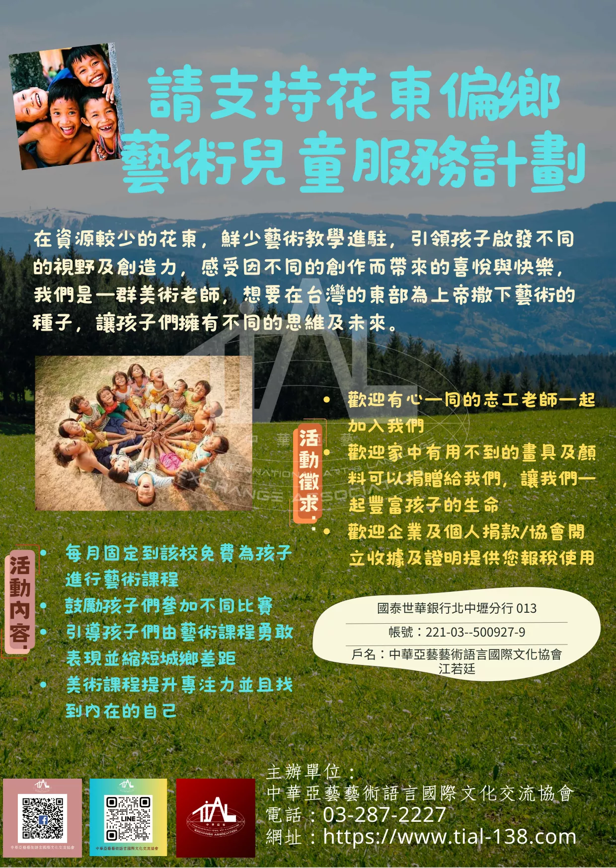 在資源較少的花東,鮮少藝術教學進駐,引領孩子啟發不同的視野及創造力,感受因不同的創作而帶來的喜悅與快樂,我們是一群美術老師,想要在台灣的東部為上帝撒下藝術的種子,讓孩子擁有不同的思維及未來。